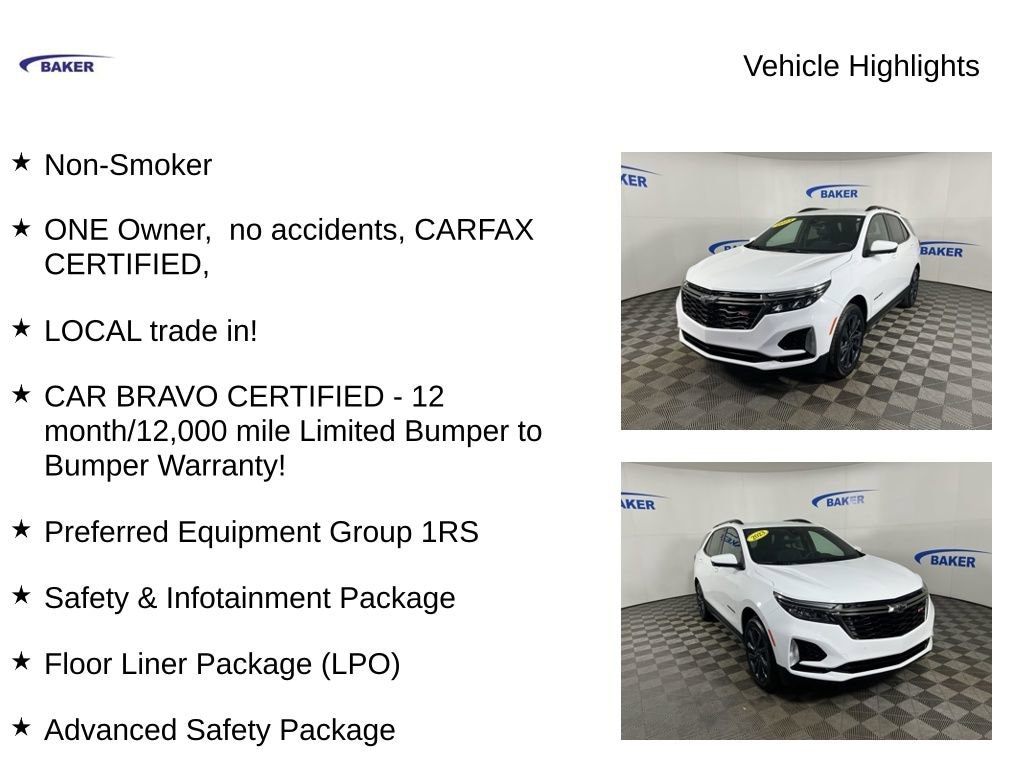 New Price! Summit White 2023 Chevrolet Equinox RS AWD 6-Speed Automatic Electronic with Overdrive 1.5L DOHC Non-Smoker, ONE Owner, no accidents, CARFAX CERTIFIED,, LOCAL trade in!, CAR BRAVO CERTIFIED - 12 month/12,000 mile Limited Bumper to Bumper Warranty!, Equinox RS, 1.5L DOHC, AWD, Summit White, Jet Black Cloth, 120-Volt Power Outlet, 19 Aluminum Wheels, 2 Rear USB Charging-Only Ports, 2-Way Power Driver Lumbar Control Seat Adjuster, Advanced Safety Package, All-Weather Floor Liners (LPO), Automatic temperature control, Bluetooth® For Phone, Driver 8-Way Power Seat Adjuster, Floor Liner Package (LPO), Front dual zone A/C, HD Surround Vision, Heated door mirrors, Heated front seats, Heated Steering Wheel, Infotainment Package, Integrated Cargo Liner (LPO), Power driver seat, Power Liftgate, Preferred Equipment Group 1RS, Radio: Chevrolet Infotainment 3 Plus System, Safety & Infotainment Package, SiriusXM Radio, Wireless Apple CarPlay/Wireless Android Auto.