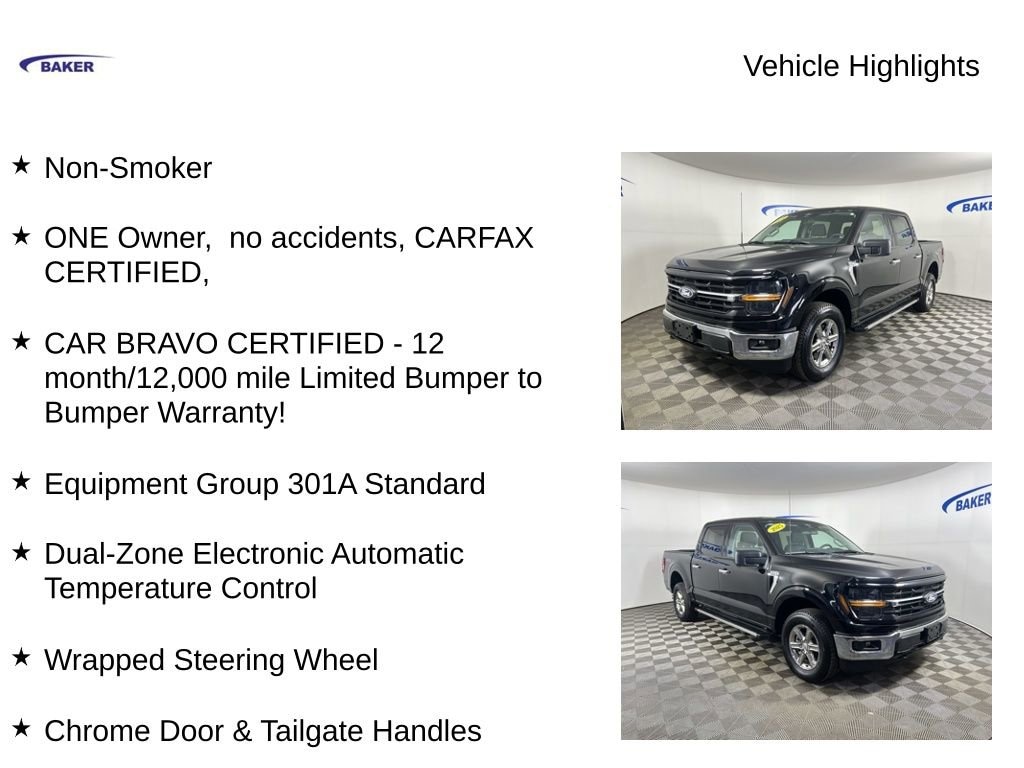 Agate Black Metallic 2025 Ford F-150 XLT 4WD 10-Speed Automatic 3.5L V6 EcoBoost Non-Smoker, ONE Owner, no accidents, CARFAX CERTIFIED,, CAR BRAVO CERTIFIED - 12 month/12,000 mile Limited Bumper to Bumper Warranty!, F-150 XLT, 3.5L V6 EcoBoost, 10-Speed Automatic, 4WD, Black w/Medium Dark Slate w/Cloth 40/20/40 Front Seat with Console, 6 Angular Bright Anodized Step Bar, Black Painted Grille w/Chrome Center Bar, Chrome Door & Tailgate Handles, Chrome Single-Tip Exhaust, Cloth 40/20/40 Front Seat w/Console, Dual-Zone Electronic Automatic Temperature Control, Equipment Group 301A Standard, Wrapped Steering Wheel.CALL US TODAY 6168373800. Recent Arrival! Odometer is 2023 miles below market average!