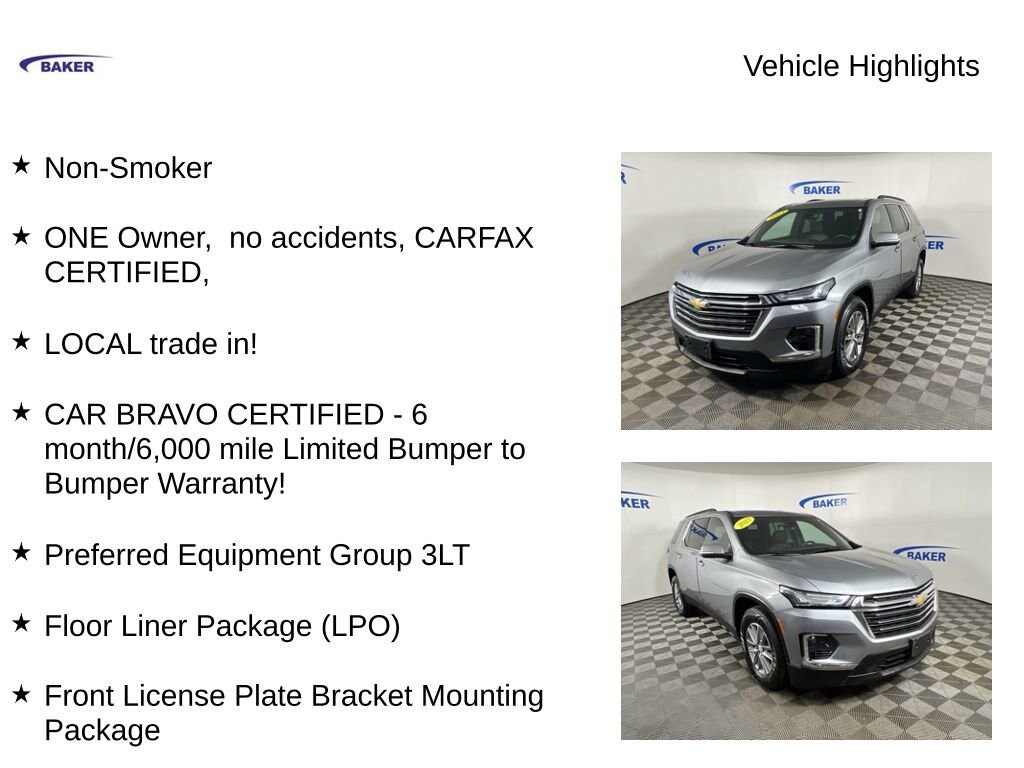 New Price! Sterling Gray Metallic 2023 Chevrolet Traverse LT Leather AWD 9-Speed Automatic 3.6L V6 SIDI VVT Non-Smoker, ONE Owner, no accidents, CARFAX CERTIFIED,, LOCAL trade in!, CAR BRAVO CERTIFIED - 6 month/6,000 mile Limited Bumper to Bumper Warranty!, Traverse LT Leather, 3.6L V6 SIDI VVT, AWD, Sterling Gray Metallic, Black Leather, 1st & 2nd Row All-Weather Floor Liner (LPO), 3rd Row All-Weather Floor Liner (LPO), 6-Speaker Audio System Feature, 6-Way Power Front Passenger Seat, 8-Way Power Driver Seat Adjuster, Air Conditioning, Apple CarPlay/Android Auto, Automatic temperature control, Exterior Parking Camera Rear, Floor Liner Package (LPO), Front License Plate Bracket Mounting Package, Heated front seats, Integrated Cargo Liner (LPO), Leather-Appointed Seat Trim, Power Driver Lumbar Control, Power driver seat, Power Liftgate, Power passenger seat, Preferred Equipment Group 3LT, Radio: Chevrolet Infotainment 3 Plus System, SiriusXM w/360L, Wheels: 18 Bright Silver-Painted Aluminum.