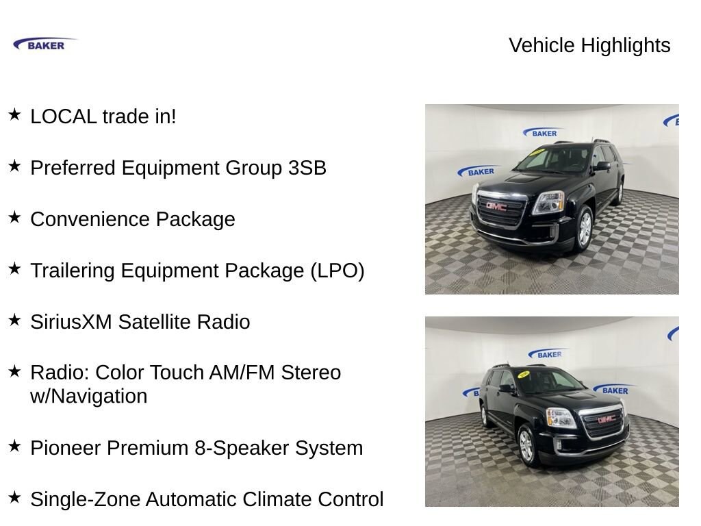 New Price! Onyx Black 2016 GMC Terrain SLE-2 AWD 6-Speed Automatic 3.6L V6 DGI DOHC VVT LOCAL trade in!, Terrain SLE-2, 3.6L V6 DGI DOHC VVT, 6-Speed Automatic, AWD, Onyx Black, Jet Black Cloth, 17 x 7 Aluminum Wheels, 8-Way Power Driver Seat Adjuster, Automatic temperature control, Class II 1-1/4 Receiver Hitch, Convenience Package, Dual Exhaust w/Premium Tips, Exterior Parking Camera Rear, Heated Driver & Front Passenger Seats, Intellilink w/Bluetooth, Pioneer Premium 8-Speaker System, Power driver seat, Preferred Equipment Group 3SB, Radio: Color Touch AM/FM Stereo w/Navigation, Remote Vehicle Start, Single-Zone Automatic Climate Control, SiriusXM Satellite Radio, Trailering Equipment Package (LPO).
