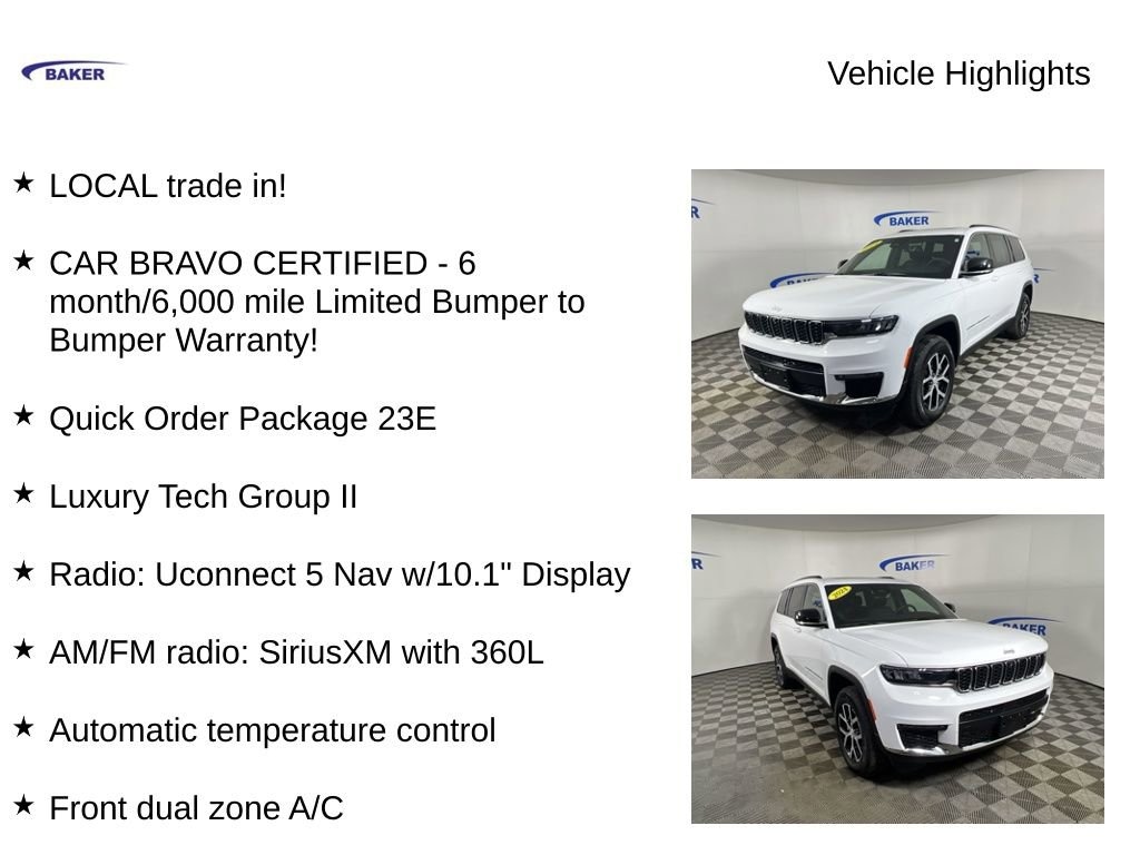 Bright White Clearcoat 2024 Jeep Grand Cherokee L Limited 4WD 8-Speed Automatic 3.6L V6 24V VVT LOCAL trade in!, CAR BRAVO CERTIFIED - 6 month/6,000 mile Limited Bumper to Bumper Warranty!, Grand Cherokee L Limited, 3.6L V6 24V VVT, 8-Speed Automatic, 4WD, Bright White Clearcoat, 2nd Row Manual Window Shades, AM/FM radio: SiriusXM with 360L, Auto-Dimming Exterior Driver Mirror, Automatic temperature control, Dual-Pane Panoramic Sunroof, Front dual zone A/C, Heated front seats, Heated rear seats, Integrated Off-Road Camera, Interior Rear Facing Camera, Intersection Collision Assist System, Luxury Tech Group II, Memory seat, ParkSense Front/Rear Park Assist w/Stop, ParkView Rear Back-Up Camera, Passive Entry - Front/Rear Doors, Liftgate, Power driver seat, Power Liftgate, Power passenger seat, Quick Order Package 23E, Radio: Uconnect 5 Nav w/10.1 Display, Rain Sensitive Windshield Wipers, Rear Back Up Camera Washer, Rearview Autodim Digital Display Mirror, Surround View Camera System, Ventilated Front Seats, Wheels: 18 x 8.0 Polished/Painted Aluminum, Wireless Charging Pad.