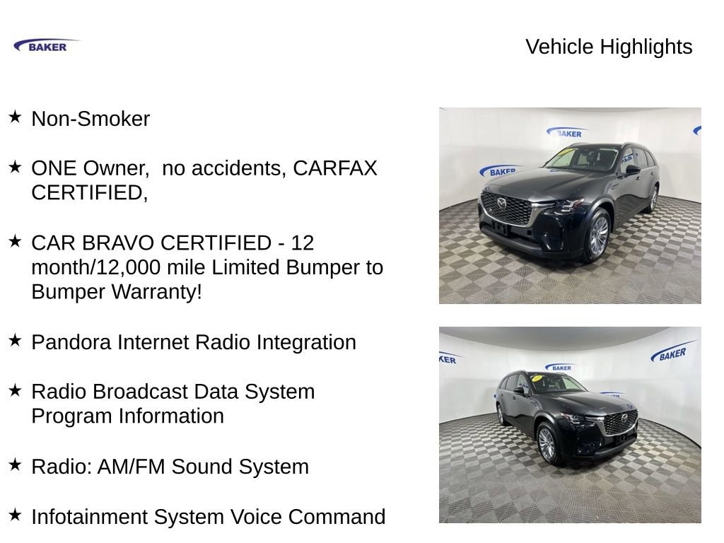 New Price! Jet Black Mica 2024 Mazda CX-90 3.3 Turbo Select AWD 8-Speed Automatic I6 Turbo Non-Smoker, ONE Owner, no accidents, CARFAX CERTIFIED,, CAR BRAVO CERTIFIED - 12 month/12,000 mile Limited Bumper to Bumper Warranty!, CX-90 3.3 Turbo Select, I6 Turbo, AWD, 8 Speakers, AM/FM radio, Automatic temperature control, Exterior Parking Camera Rear, Fully automatic headlights, Infotainment System Voice Command, Pandora Internet Radio Integration, Power Liftgate, Radio Broadcast Data System Program Information, Radio: AM/FM Sound System.
