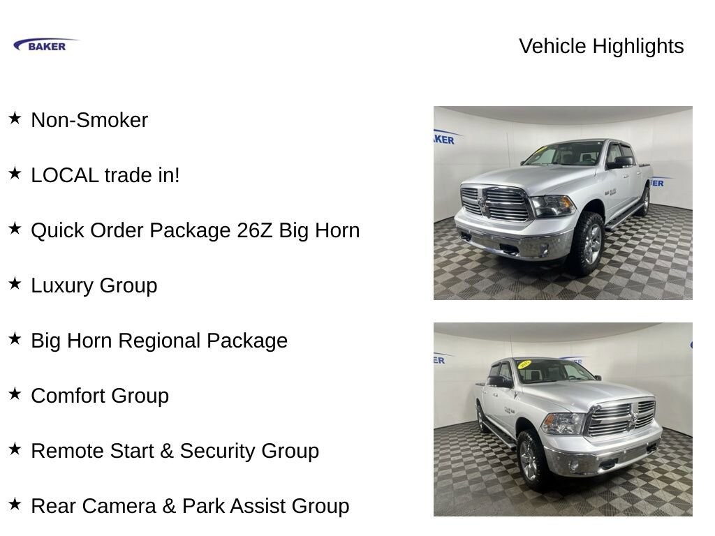 New Price! Bright Silver Metallic Clearcoat 2015 Ram 1500 Big Horn 4WD 8-Speed Automatic HEMI 5.7L V8 Multi Displacement VVT Non-Smoker, LOCAL trade in!, 1500 Big Horn, HEMI 5.7L V8 Multi Displacement VVT, 8-Speed Automatic, 4WD, Bright Silver Metallic Clearcoat, Diesel Gray/Black Cloth, 6 Month Trial (Reg. Required), 6 Month Trial (Registration Required), 8.4 Touchscreen Display, Ash Tray Lamp, Auto-Dimming Exterior Mirrors, Big Horn Badge, Big Horn Regional Package, Bright/Bright Billets Grille, Class IV Receiver Hitch, Comfort Group, Electric Shift-On-Demand Transfer Case, Electroluminescent Instrument Cluster, Exterior Mirrors Courtesy Lamps, Exterior Mirrors w/Supplemental Signals, Fog Lamps, For Details Go To DriveUconnect.com, Glove Box Lamp, GPS Antenna Input, Harman Radio Manufacturer, Heated Front Seats, Heated Steering Wheel, Integrated Voice Command w/Bluetooth, Leather Wrapped Steering Wheel, Luxury Group, Media Hub (SD, USB, AUX), Nav-Capable! See Dealer for Details, Overhead Console w/Garage Door Opener, ParkSense Front/Rear Park Assist System, ParkView Rear Back-Up Camera, Power 10-Way Driver Seat, Power Folding Mirrors, Power Heated Fold-Away Mirrors, Power Lumbar Adjust, Premium Cloth 40/20/40 Bench Seat, Quick Order Package 26Z Big Horn, Radio: Uconnect 8.4A AM/FM/SXM/BT, Rear Camera & Park Assist Group, Rear Dome w/On/Off Switch Lamp, Rear-View Auto-Dimming Mirror w/Microphone, Remote SD Card Slot, Remote Start & Security Group, Remote Start System, Security Alarm, Steering Wheel Mounted Audio Controls, Sun Visors w/Illuminated Vanity Mirrors, Uconnect Access, Underhood Lamp, Universal Garage Door Opener, Wheels: 20 x 8 Aluminum Chrome Clad.